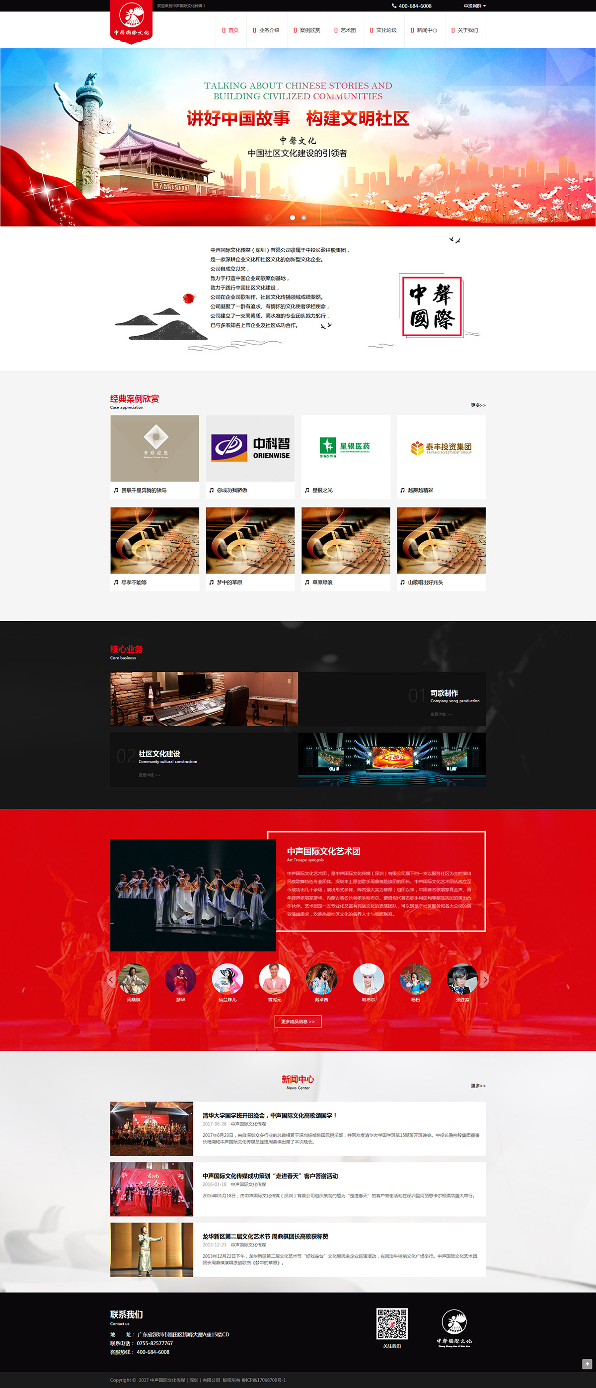 中声国际文化传媒(深圳)有限公司隶属于中投长盈控股集团,是一家深耕企业文化和社区文化的创新型文化企业。公司自成立以来,致力于打造中国企业司歌原创基地,致力于践行中国社区文化建设,公司在企业司歌制作、社区文化传播领域成绩斐然。公司凝聚了一群有追求、有情怀的文化使者承担使命,公司建立了一支高素质、高水准的专业团队戮力躬行,已与多家知名上市企业及社区成功合作。